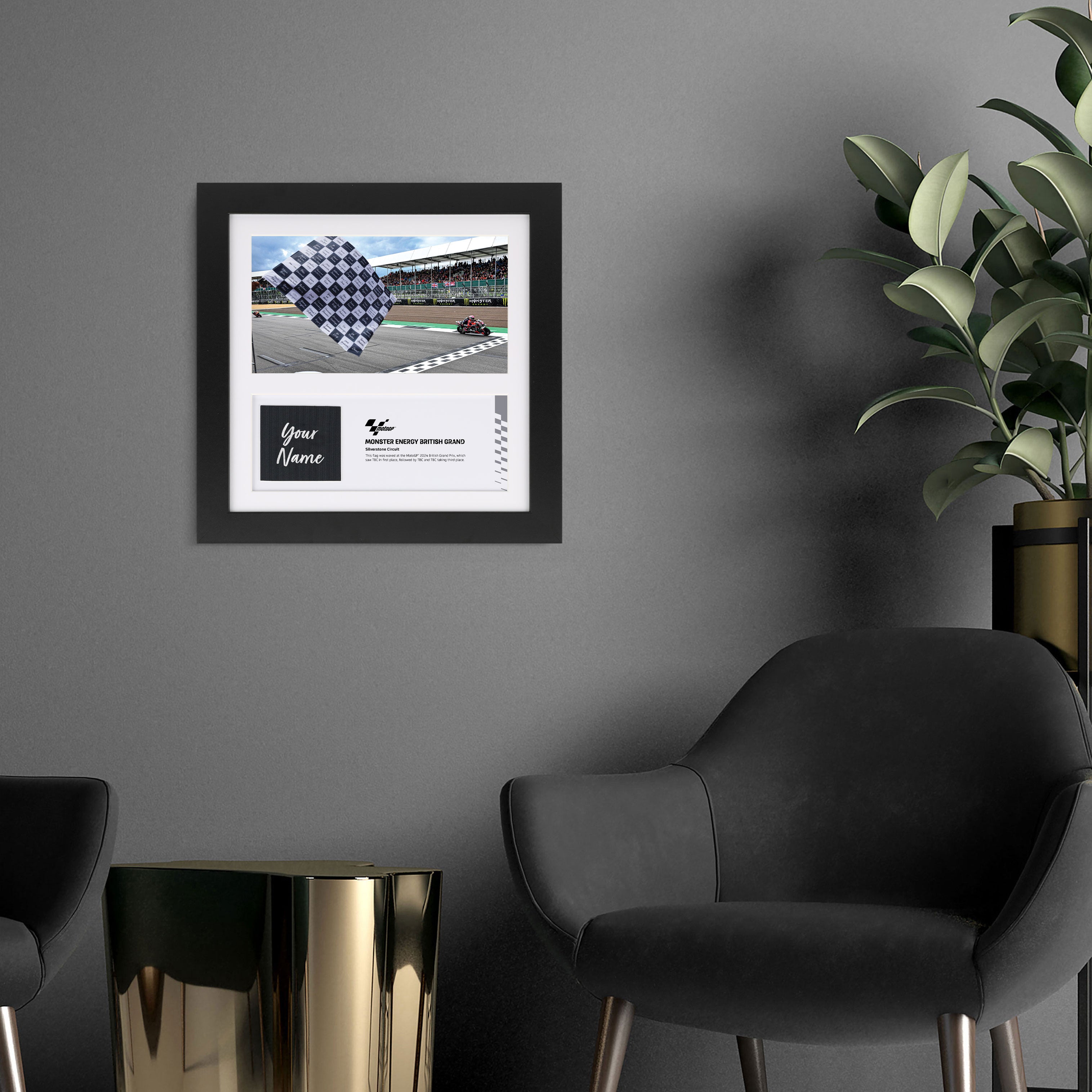 The square with your printed name will be expertly mounted and framed along with a photograph taken at the race by a professional MotoGP™ photographer and a plaque to mark the occasion.